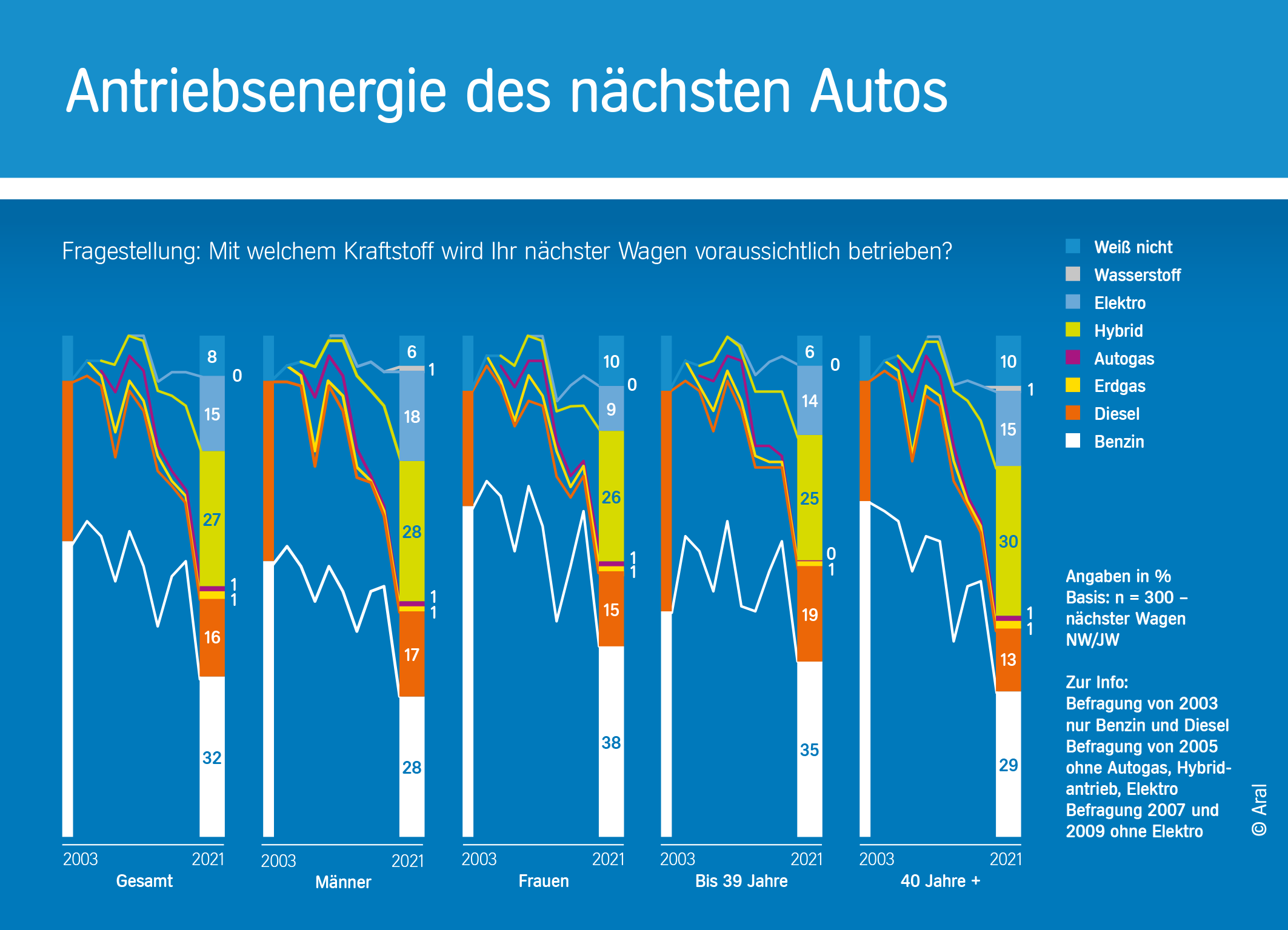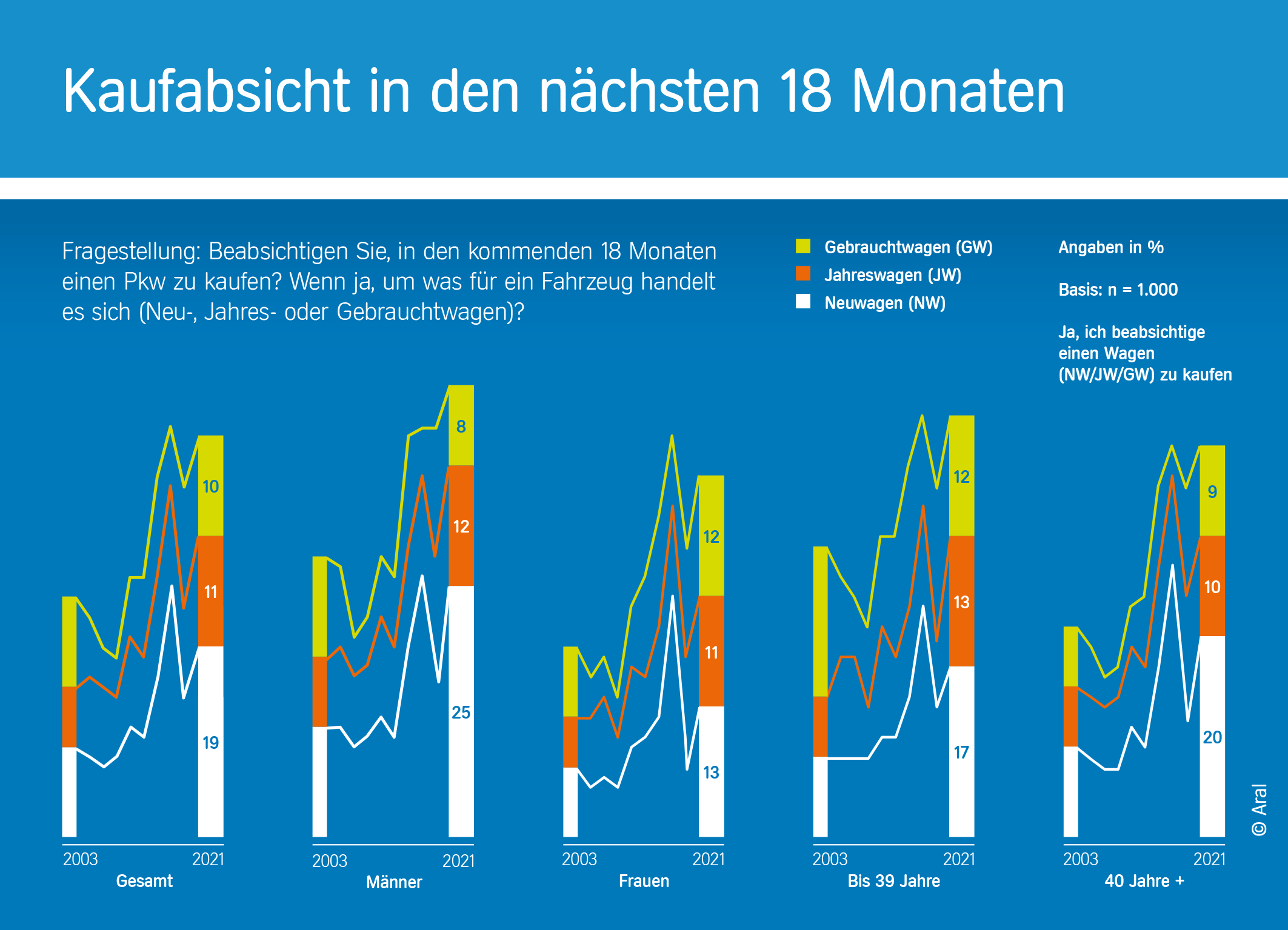 Aral legt die repräsentative Studie „Trends beim Autokauf“ im Zwei-Jahres-Rhythmus auf und befragt die Autofahrenden zu ihren Vorlieben beim Autokauf sowie ihrer Einstellung zu Mobilitätsthemen. Durch die lange Historie der Erhebung mit immer wiederkehrenden Fragen können Langfristtrends zuverlässig von modischen Episoden unterschieden und das Stimmungsbild unter den Autokäufern trennscharf wiedergegeben werden.